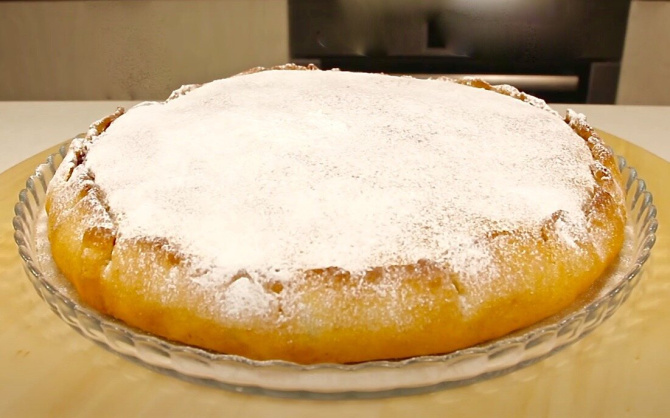 Потом раскатайте последнюю заготовку и прикройте этим пластом корж вместе с начинкой. Края этого коржа подверните на верх пирога, закрепив специальным защипом. Выпекайте в духовке, разогретой до 180 градусов, в течение 35-40 минут. Приятного аппетита!