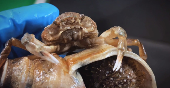 На этот раз в своем тг-канале он показал, как к нему в трал попала целая живая композиция из раковины, морского ежа, балянусов и краба.