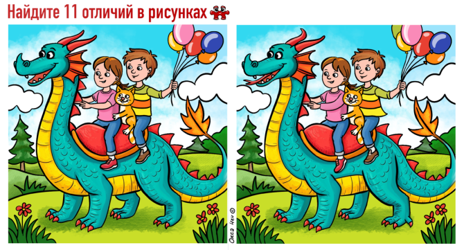 На картинке вы можете увидеть две практически идентичные ситуации. Дракон везет детей и котика к светлому будущему. Все бы ничего, но здесь есть ровно 11 отличий.