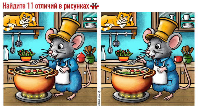 Посмотрите на мышку, которая увлеченно занимается готовкой. Она представлена здесь в двух экземплярах. Почему? Да потому что между картинками 11 отличий — попробуйте найти каждое из них всего за 1 минуту, чтобы сделать первый шаг к вашему интеллектуальному развитию.
