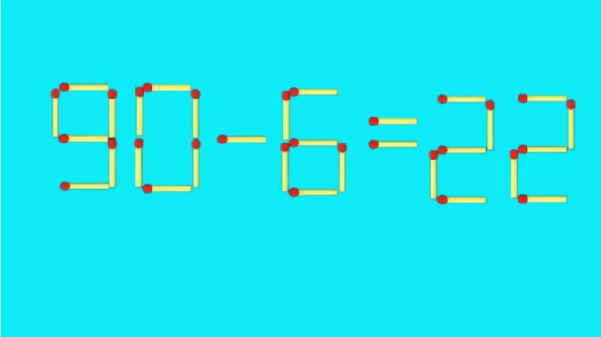 Итак, посмотрите на изображение. Как вы уже догадались, пример «90-6=22» решён неверно, и нам нужно это исправить. Переставьте одну спичку там, чтобы не нарушать привычный арифметический алгоритм. Наиболее смекалистые сразу поняли, что нужно убрать 9, а цифру 6 чуть-чуть подправить. Вот так у нас и получилось верное равенство.