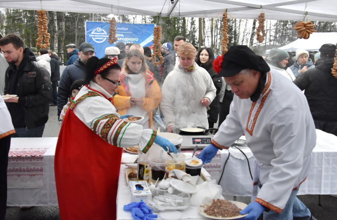В шатре санатория-профилактория «Ковдорский» гостей ждали традиционные русские яства: горячий чай, сбитень с киселём, свежеиспечённые блины, каша с грибами и разнообразная выпечка.