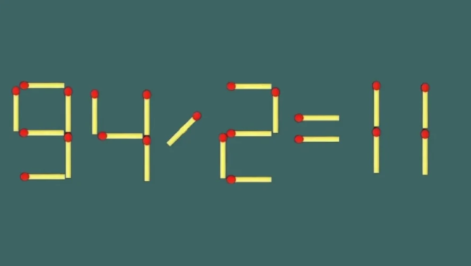 Представляем вашему вниманию пример «94/2=11», решённый с ошибкой. Для того, чтобы получить верное равенство, нужно поменять местами всего одну спичку.