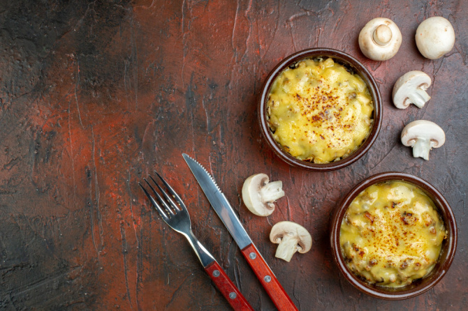 Помешивайте овощную смесь, пока грибы не будут готовы, а затем снимите их с плиты. В сковородку добавьте сметану, поперчите и посолите. Возьмите керамические формочки, переложите туда жареные грибы и посыпьте сверху толстым слоем тёртого сыра.
