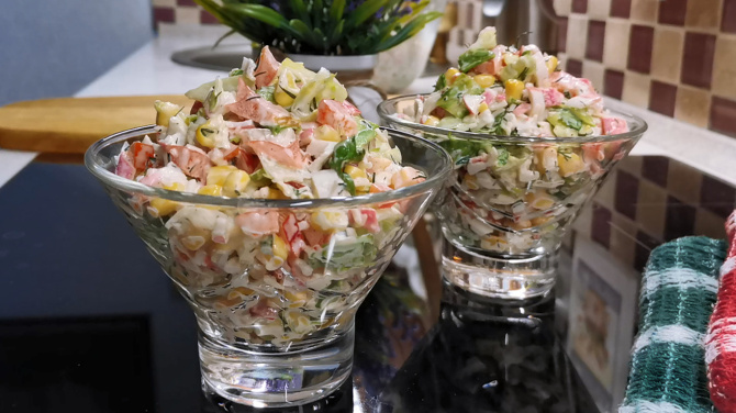 Крабовые палочки нужно резать не слишком мелко, иначе они просто не будут ощущаться в салате. Листья салата также режем достаточно крупно. Не нужно переживать, что его чрезмерное количество приведёт к повышенной влажности салата. Нейтрализировать это поможет другой ингредиент.