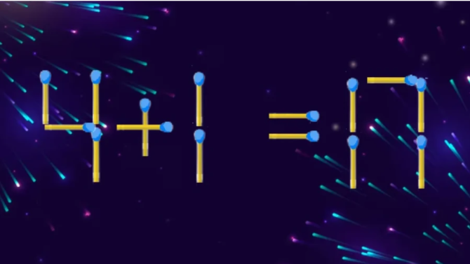 На изображении нас встречает равенство «4+1=17», которое выполнено с заметной ошибкой. Вам нужно переместить всего лишь одну спичку, чтобы пример решался верно. Задействуйте смекалку на максимум.