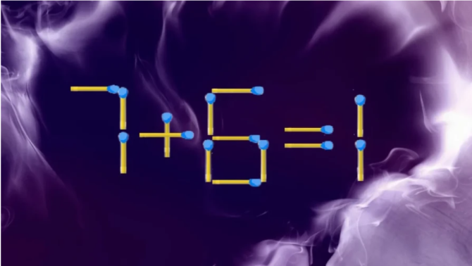 На картинке изображён пример «7+6=1», который, как видите, решён неверно. Нужно переставить одну спичку, чтобы убрать это недоразумение. Уже сообразили, что к чему?