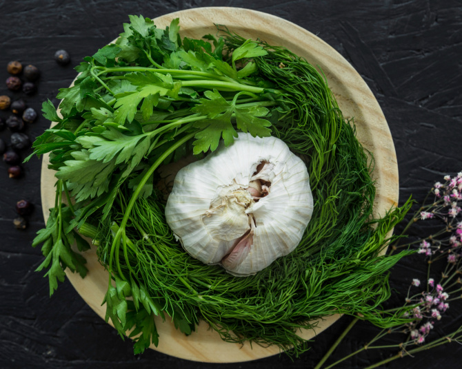Здесь можно экспериментировать с пропорциями, но этот вариант усреднённый. Итак, в стакан кладём зелень с веточками, добавляем соль и чеснок. В выборе зелени нет никаких ограничений. Вполне допустима кинза, базилик или чесночные стрелки.