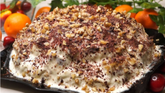 Когда корж будет готов, его нужно обрезать так, чтобы получился круг. Оставшиеся куски не выбрасывайте — поделите их на небольшие квадраты. Мелко порубите грецкие орехи и приступайте к приготовлению крема из сметаны и сахара.