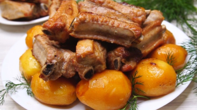 Свиные рёбрышки в сочетании с золотистым картофелем. Ммм… Просто пальчики оближешь. Иногда хочется приготовить нечто простое, без долгих заморочек, а это блюдо как раз из такого разряда: оно по-домашнему уютное и заставляет домашних забыть слова за столом во время еды. Кулинарный блогер Наталья Калнина на своем опыте убедилась, что за столом домочадцы иной раз и разговаривают забывает, ведь это так вкусно!