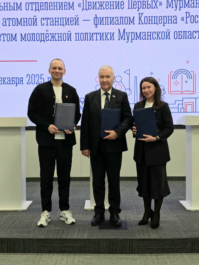После пресс-конференции в Центре управления регионом прошла торжественная церемония подписания Соглашения о сотрудничестве между Региональным отделением «Движение первых», Кольской атомной станцией и Комитетом молодёжной политики Мурманской области. В рамках него на 2026 год запланированы мероприятия по профориентационному самоопределению детей и молодёжи.