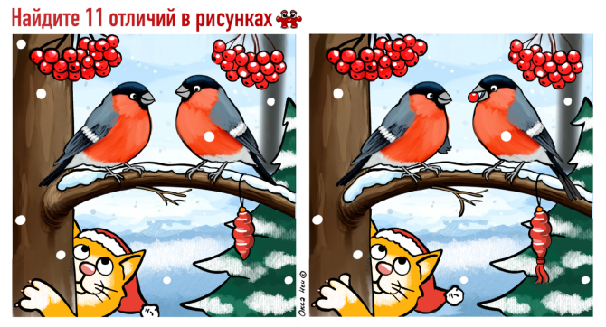 Обратите внимание на задачку, которой поделился Журнал головоломок. Здесь вы видите две одинаковые ситуации: кот спрятался за деревом и наблюдает за снегирями. Но все не так просто. На картинках можно найти 11 явных отличий. Ваша задача — справиться с этим заданием за одну минуту.