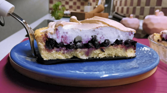 Теперь осталось собрать пирог. Достаньте тесто, выложите туда сначала ягоды, а затем размажьте меренговый крем. Отправьте пирог снова в духовку выпекаться ещё в течение 15 минут при 180 градусах. Доставайте, как только меренга слегка потемнеет и затвердеет.
