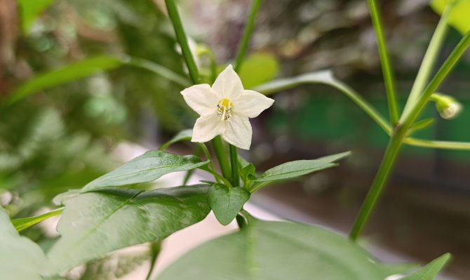 Одно из растений — стручковый перец. Его белые цветочки с фиолетовыми пыльниками и пятью лепестками могут вырасти до сантиметра в диаметре.