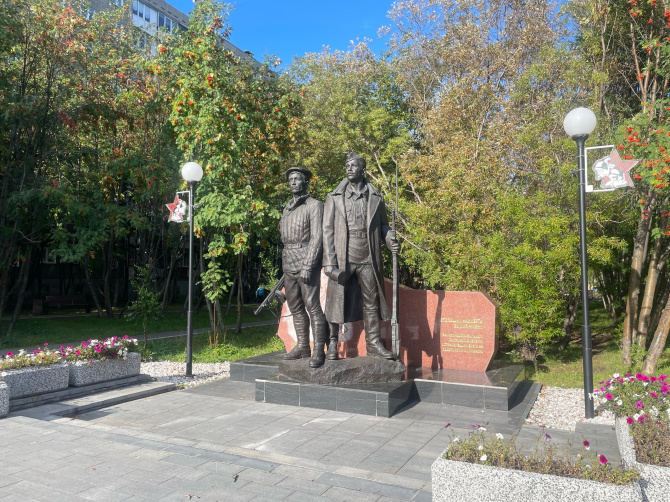 Стартуя от стелы «Мурманск в моем сердце», направляясь по ходу движения автомобилей, вы сразу же попадаете на аллею имени Полярной дивизии на проспекте Героев-Североморцев. Ее заложили ветераны в 1991 году, здесь был установлен памятный камень. 2 октября 2020 года на его месте состоялось торжественное открытие памятника воинам Полярной дивизии.