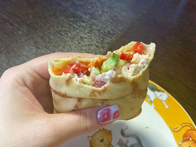 «А мы решили соединить шаурму с Масленицей и на выходных приготовили блинную шаурму. Просто завернули все ингредиенты в блин и получилось очень вкусно и нежно», - поделилась с нашей редакцией читательница Арина.