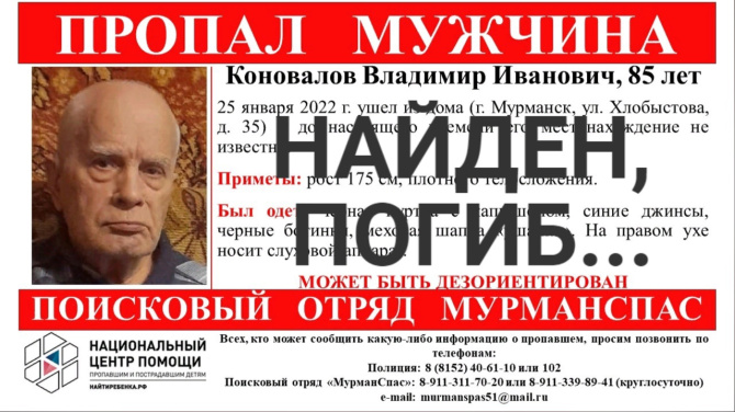 По информации поискового отряда "МурманСпас", поиски Владимира Ивановича Коновалова прекращены. Пенсионер погиб.
