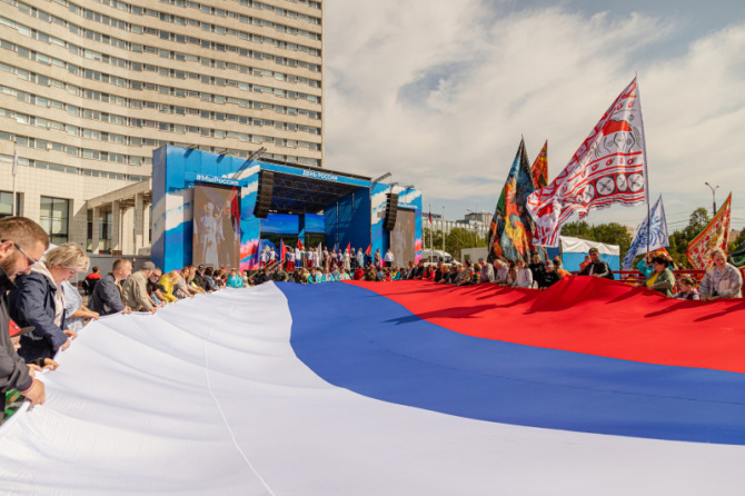 В Мурманске сейчас проходят праздничные мероприятия, посвященные Дню России. На площади Пять Углов собрались люди, чтобы весело отметить этот день. Массовое гуляние с песнями и хороводами. Также участники развернули огромный флаг России.
