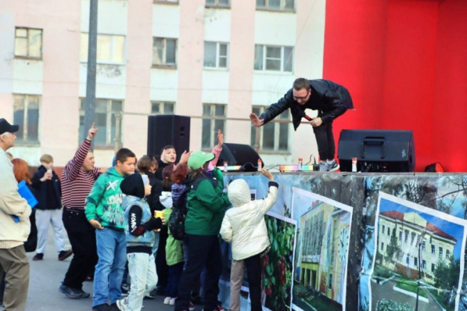 Празднование началось с шествия. Жители Никеля прошли от пересечения Гвардейского проспекта и улицы Победы до площади им. Ленина.