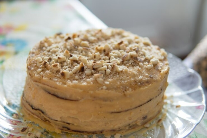 Итак, вам понадобятся следующие ингредиенты: яйца (3 шт), сахар (80 г), грецкие орехи (200 г), разрыхлитель (1 чайная ложка), соль (¼ чайной ложки), банан (1 шт), варёное сгущённое молоко (150 г) и сметана (2 столовые ложки).