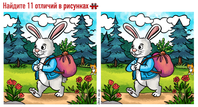 Посмотрите на картинку выше. Здесь изображен заяц, который явно куда-то торопится. Ваша задача заключается в том, чтобы понять: какие 11 отличий есть между двумя изображениями.