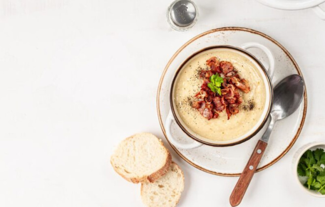 Для приготовления пригодятся вода — 1.6 — 1.7 литра, , картофель среднего размера — 4−5 клубней, морковь — 1 штука, смесь свежемолотых перцев (черный, душистый, розовый) — по вашему вкусу, зеленый лук свежий — небольшой пучок, другие специи: сушеный чеснок, паприка, прованские травы, говяжий бекон — 1 упаковка (190 г), луковица репчатая — 1 крупная головка, лавровый лист — 1−2 штуки, соль каменная — для корректировки вкуса, укроп свежий — несколько веточек.