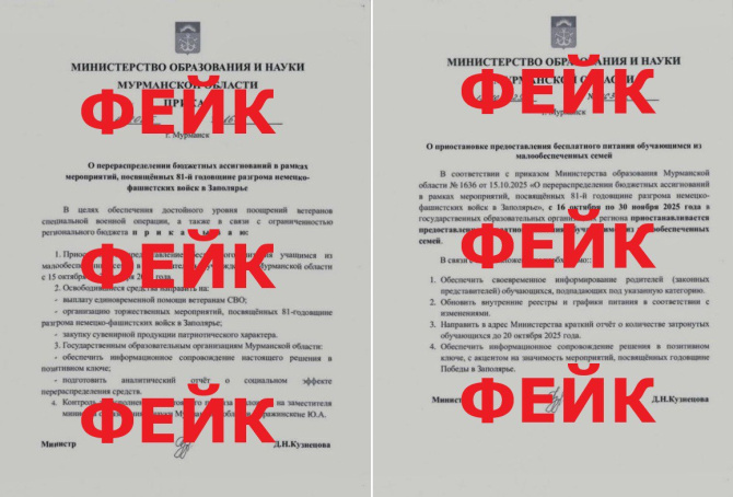 Оперативный штаб Мурманской области предупреждает жителей о появлении в соцсетях поддельных приказов. В этих документах утверждается, что школьникам из малообеспеченных семей не будет предоставляться бесплатное питание, а выделенные на него средства перенаправлены на выплаты ветеранам СВО и проведение праздничных мероприятий.