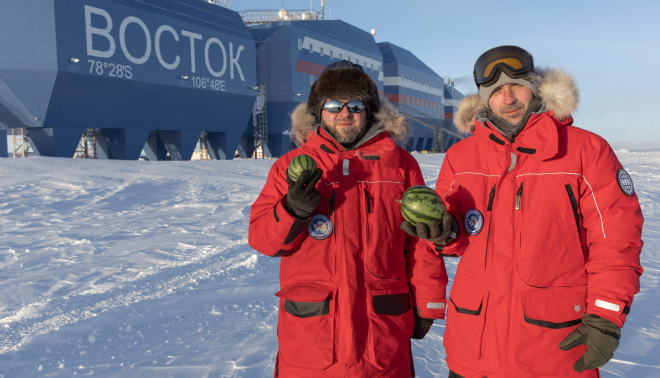 В оранжерее станции «Восток» ученые вырастили и собрали урожай арбузов с красной и желтой мякотью. Спустя сто дней несколько высаженных растений дали четыре сочных плода.