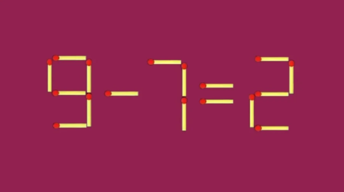 Посмотрите на изображение: вычисление «9-7=2» срочно требует вашей помощи! Без вас тут точно не обойтись. Как вы уже поняли, пример выполнен с ошибкой. Подумайте, что нужно сделать со спичками, чтобы получить верное равенство. Ну, как успехи? Смотрите, нужно превратить девятку в пятёрку, а свободную спичку направить точно в ответ. Вот таким образом мы и получаем корректную запись.