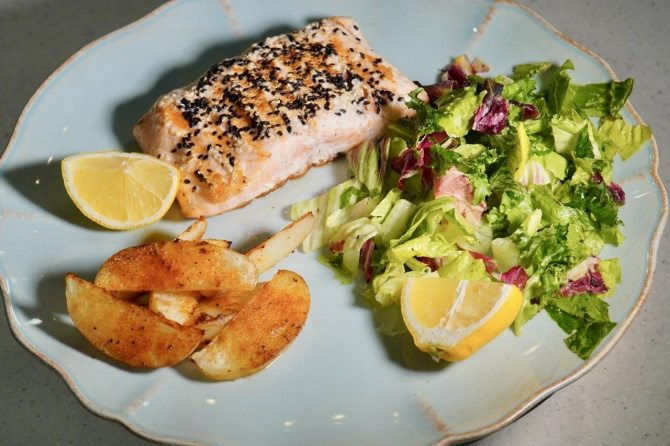 Достаньте листья салата, заправьте оливковым маслом, добавьте лимонный сок, цедру, посолите, поперчите. На этом салат готов — теперь осталось соединить все ингредиенты. Это готовая рыба, запечённый картофель и салат. Украсить дольками лимона и можно подавать к столу.