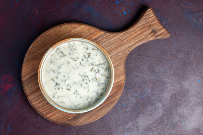 Прежде чем добавлять красный лук, его нужно мелко нарезать и обдать кипятком в течение 10 секунд. Таким образом вы уберёте неприятную горечь и оставите сладковатый привкус. Петрушку лучше заменить на укроп, он сделает соус более свежим.