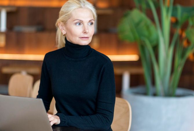 2. На первый план осенью 2025 года выходят строгие водолазки, которые вполне уместно сочетать с объёмными вещами: здесь вариантов — масса! Можно и прямые брюки примерить, и юбками необычной формы.