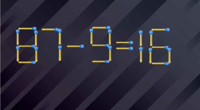 Посмотрите на изображение: пример «87-9=16» выполнен неправильно и противоречит любой арифметической логике. Как и всегда, нужно передвинуть всего одну спичку, чтобы решение стало верным.
