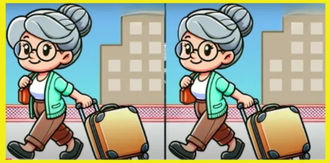 Итак, на двух изображениях вы видите пожилую женщину в очках. У неё в руках — дорожный чемодан на колёсиках. Естественно, на первый взгляд между картинками абсолютно отсутствуют какие-либо различия, но на самом деле здесь скрыты 3 маленьких детали, вносящие дисбаланс. Попробуйте немного усложнить задачу, поставив таймер на 15 секунд.