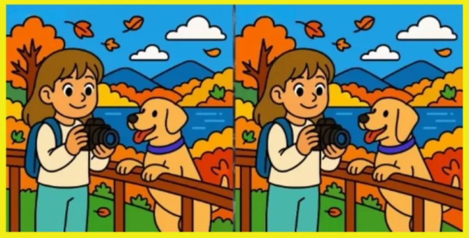 На картинке вы видите два вроде бы одинаковых рисунка с типичным осенним пейзажем: стоящая девушка в парке в компании пёсика. Сначала кажется, будто на иллюстрации нет никаких отличий, но их оказывается целых три. Засеките время на 15 секунд и попробуйте их отыскать.