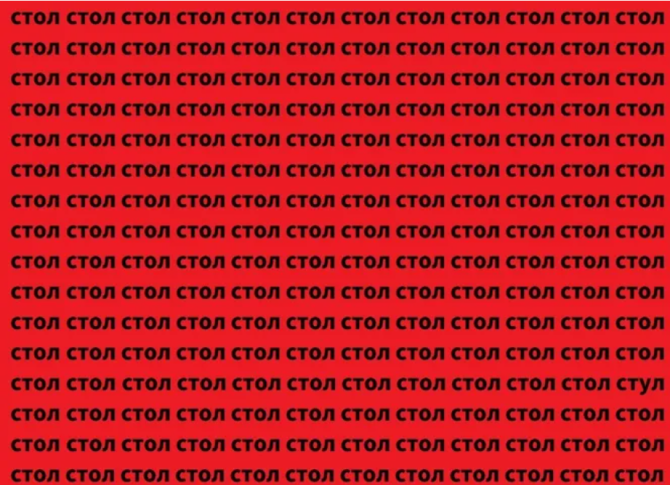 На красном фоне мы видим множество слов «стол». Среди них нужно найти «стул» — он расположен в единственном экземпляре. Поставьте таймер на 6 секунд и постарайтесь зацепиться глазами за это слово, которое выбивается из сонма многочисленных «столов».