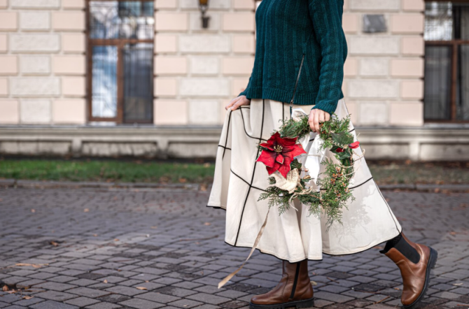 Обратите внимание на модели с запахом, со строчкой или поясом-кулиской, которые подчёркивают эту зону. Если касаться выбора юбки, то здесь подойдёт А-силуэт или слегка расклёшенный фасон. На ноги — сапоги на скромном каблуке, ботинки или угги, подчёркивающие стройность ног.