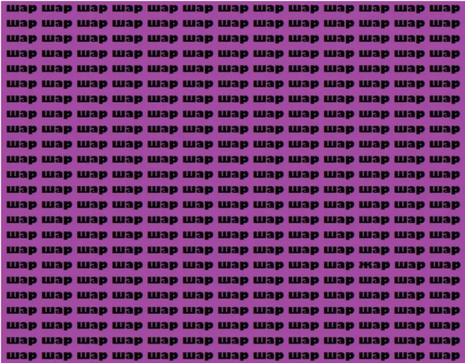 Итак, взглянем на иллюстрацию: среди одинаковых слов «шар» спрятался «жар». Чтобы стать призёром и поставить очередной рекорд, нужно успеть отыскать слово за 7 секунд. Позаботьтесь о том, чтобы никакие посторонние звуки или мысли не отвлекали от головоломки.