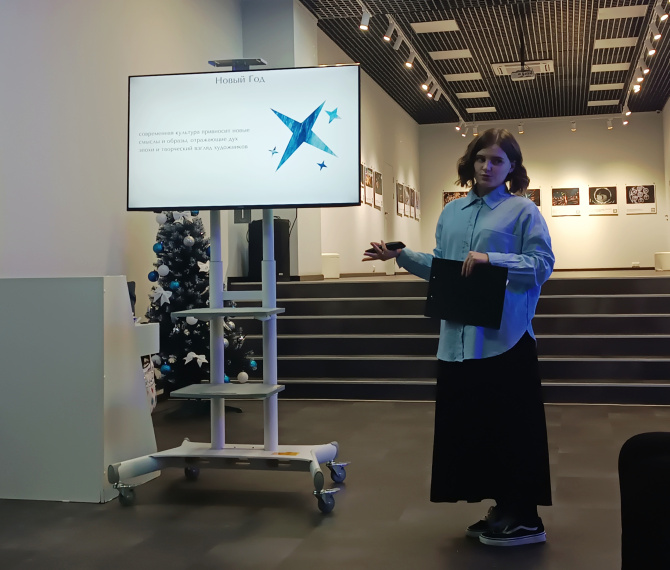 В Центре современного искусства «Сопки 21А» состоялась увлекательная лекция, посвящённая переосмыслению новогодних образов в актуальном художественном контексте. Специалист Виктория Яковлева предложила аудитории погрузиться в мир, где знакомые с детства символы — от Деда Мороза до ёлочных шаров — обретают новые, порой неожиданные, смыслы.